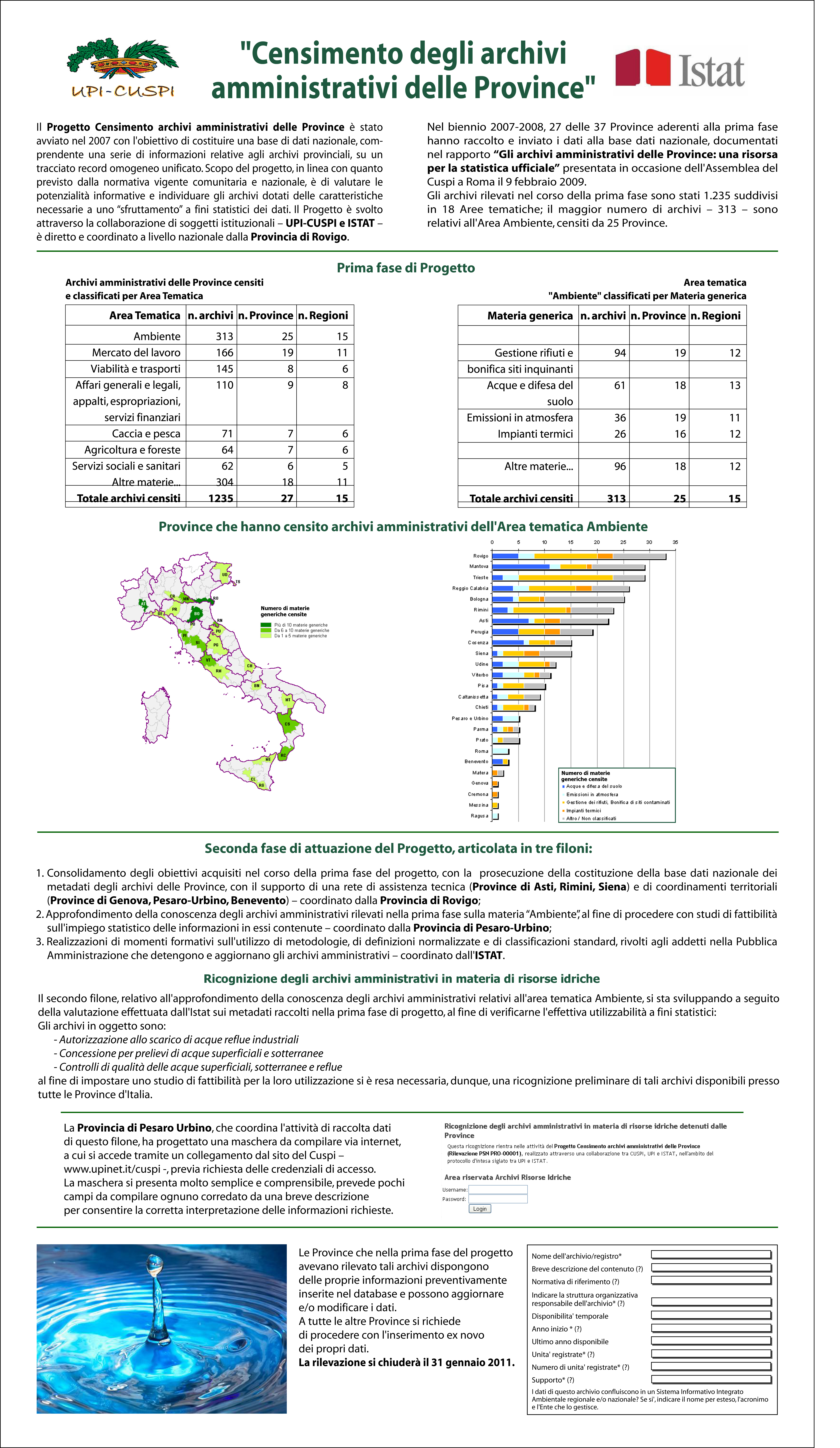 Nell'ambito della prima fase del progetto “Censimento degli archivi amministrativi delle Province” previsto dal Programma Statistico Nazionale 2011-2013 - rilevazione PSN PRO-00001 - sono stati individuati i seguenti cinque archivi amministrativi in materia ambientale/risorse idriche. Tali archivi contengono informazioni potenzialmente utilizzabili a fini statistici: autorizzazione allo scarico di acque reflue, concessioni per prelievi di acque superficiali, concessioni per prelievi di acque sotterranee, controlli di qualità delle acque superficiali e sotterranee e controlli di qualità delle acque reflue.